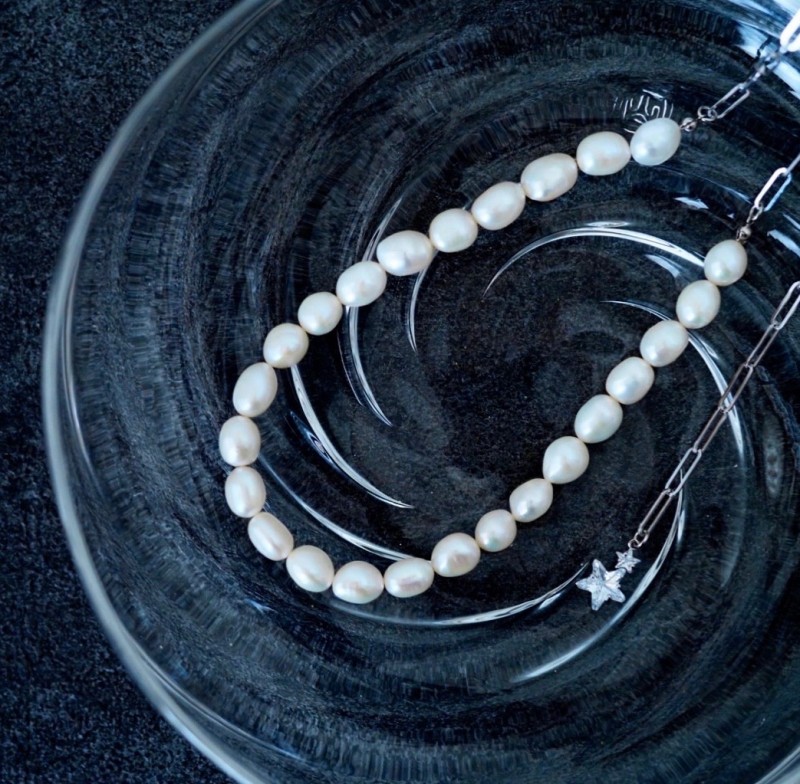 4wayの淡水パールとシルバーチェーンのコンビネックレス。 どちらを前にするかで雰囲気も変わり、 2連にしたり、Y字にしたり色んな表情を見せることができます。